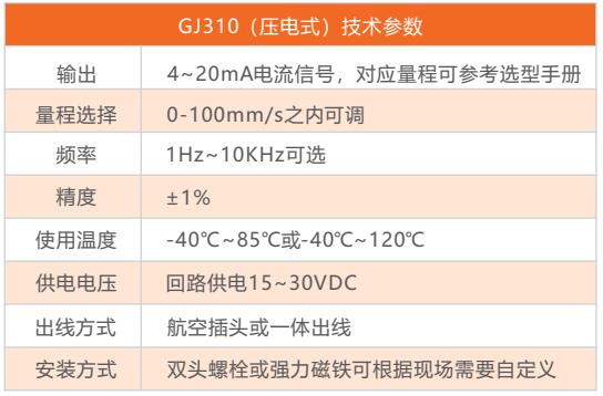 传感器灵敏度为100 mV/g ;应用于大型旋转设备壳体振动测量,如风机、水泵、发电机、齿轮箱等。有两针式航空插头输出和集成整体铠装电缆两种出线方式。